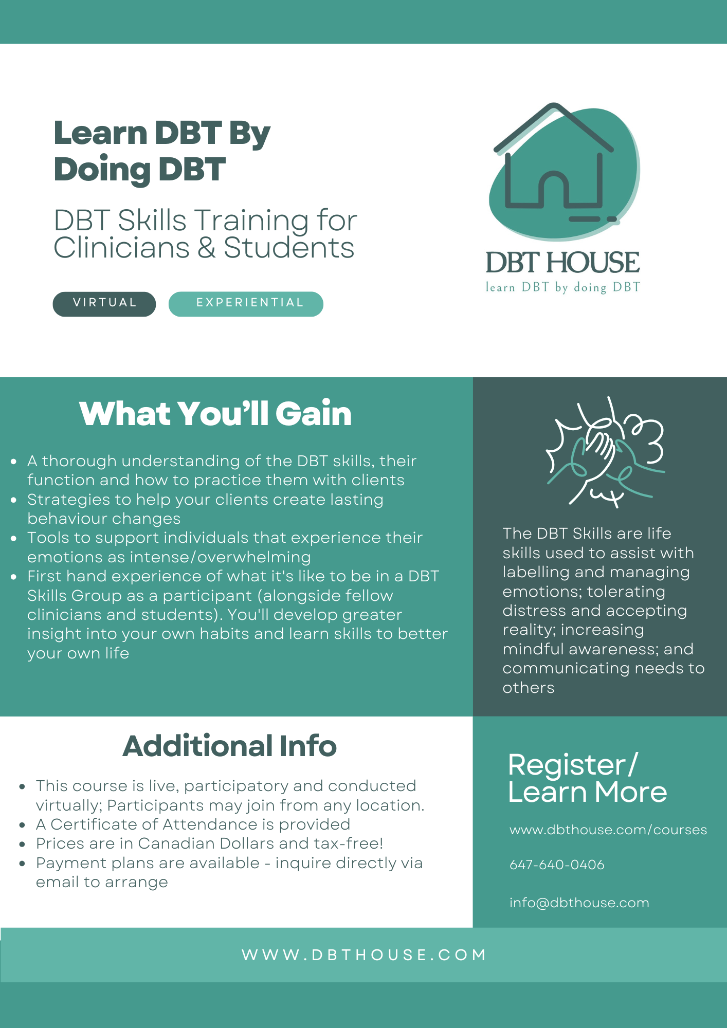 At DBT HOUSE, we believe the best way to learn Dialectical Behaviour Therapy Skills is to experience it yourself. Our Virtual DBT Skills Trainings are designed for mental health professionals and students who want effective, evidence-based tools to support their clients—while also strengthening their own skills and self-awareness.