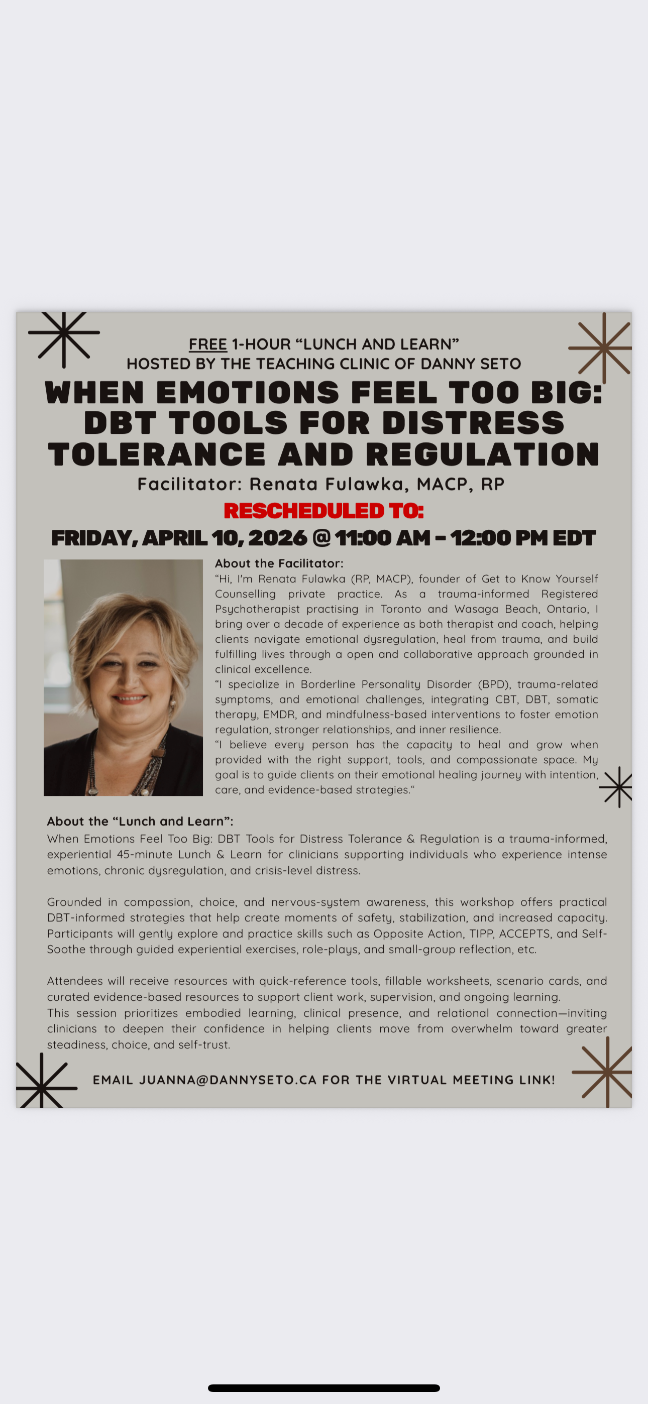 The topic, “When Emotions Feel Too Big: DBT Tools for Distress Tolerance and Regulation” will be led by Renata Fulawka, RP and Supervisor-in-Training.