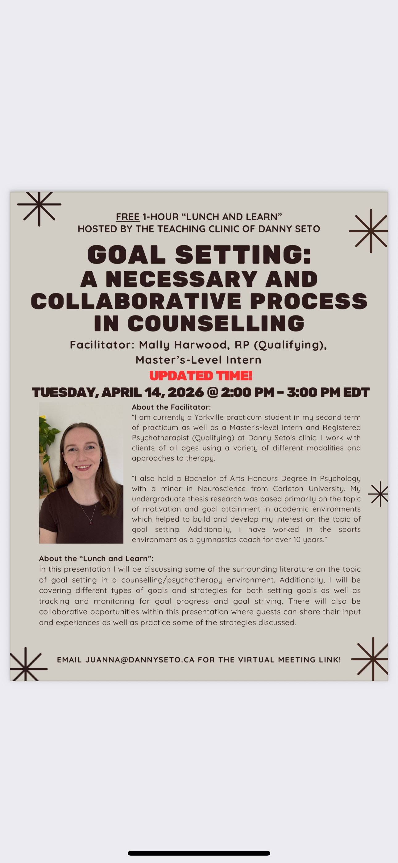 The topic, “Goal Setting: A Necessary and Collaborative Process in Counselling” will be led by Mally Harwood, Master’s-Level Practicum Intern and RP (qualifying).