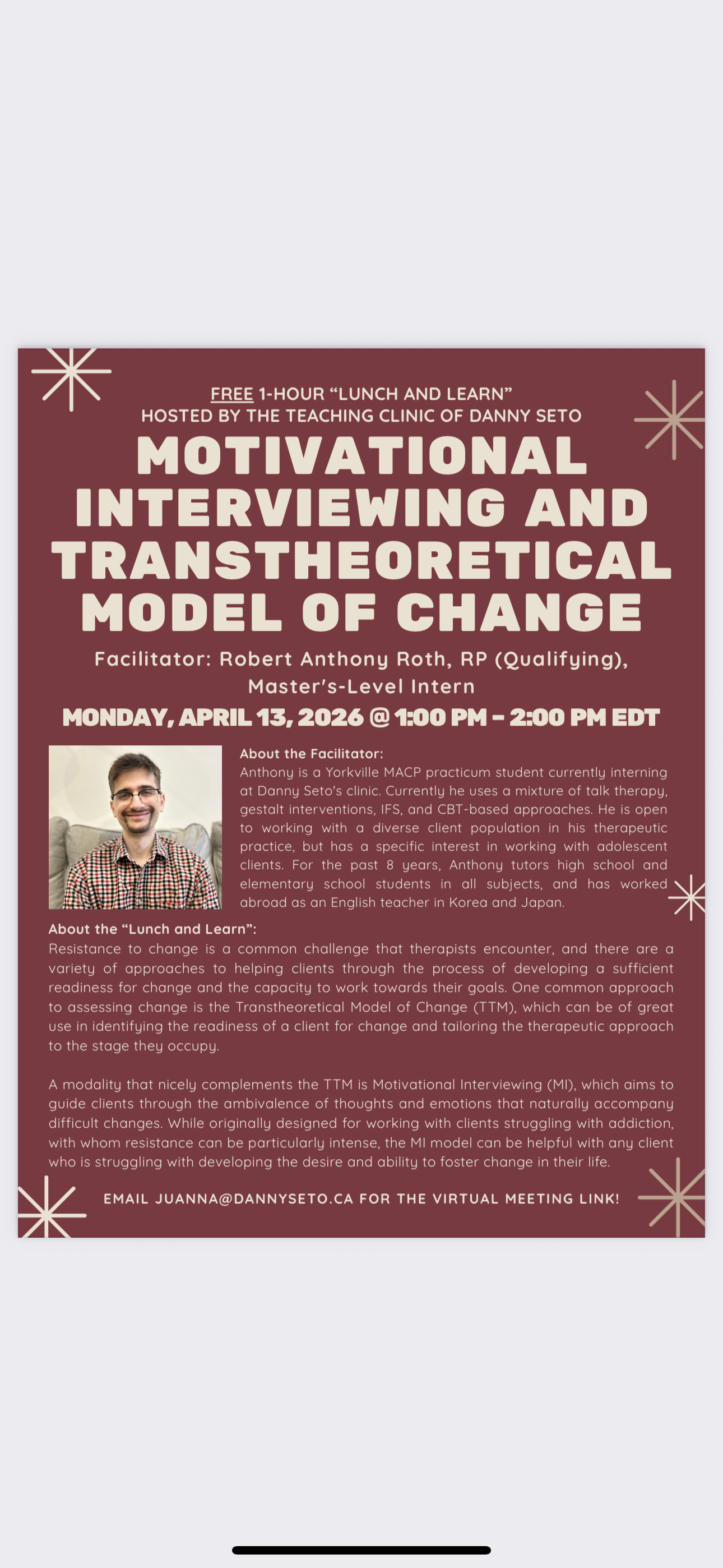The topic, “Motivational Interviewing and Transtheoretical Model of Change”will be led by Robert Roth, Master’s-Level Practicum Intern and RP (qualifying).
