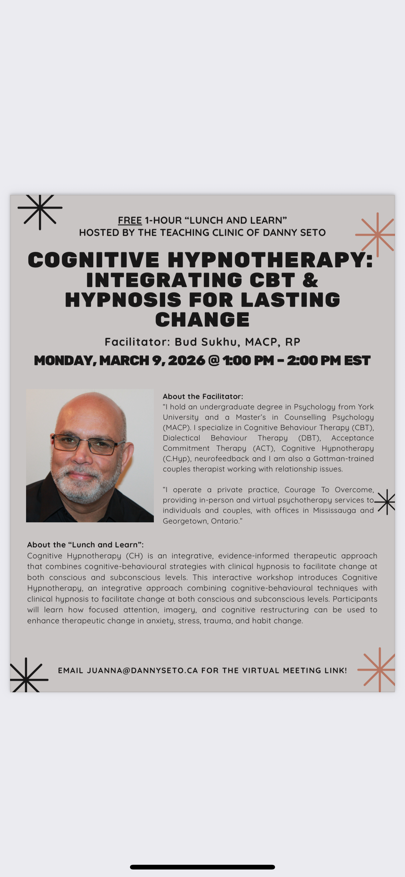 The topic, “Cognitive Hypnotherapy: Integrating CBT & Hypnosis for Lasting Change” will be led by Bud Sukhu, RP and Supervisor-in-Training.