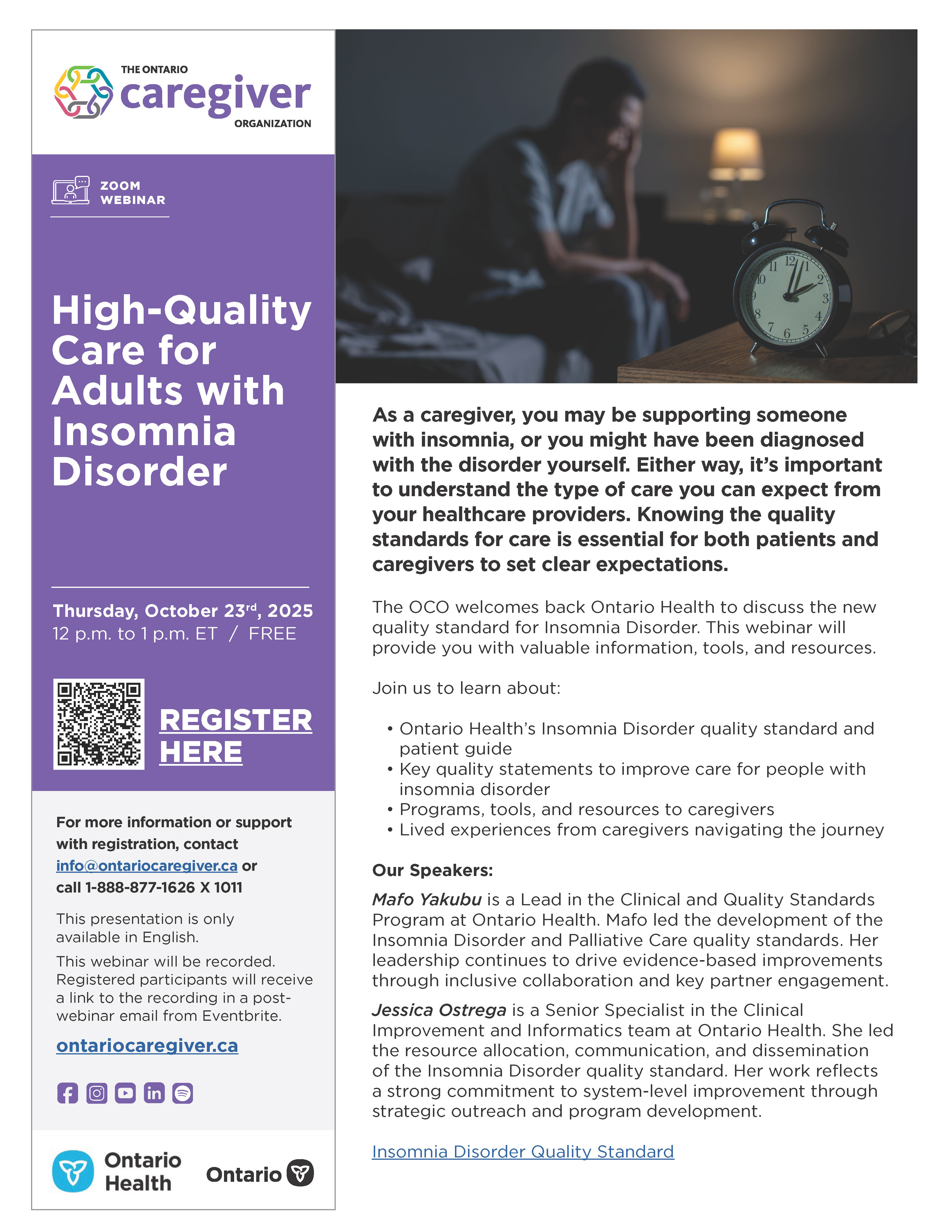 The OCO welcomes back Ontario Health to discuss the new quality standard for Insomnia Disorder. This webinar will provide you with valuable information, tools, and resources.
