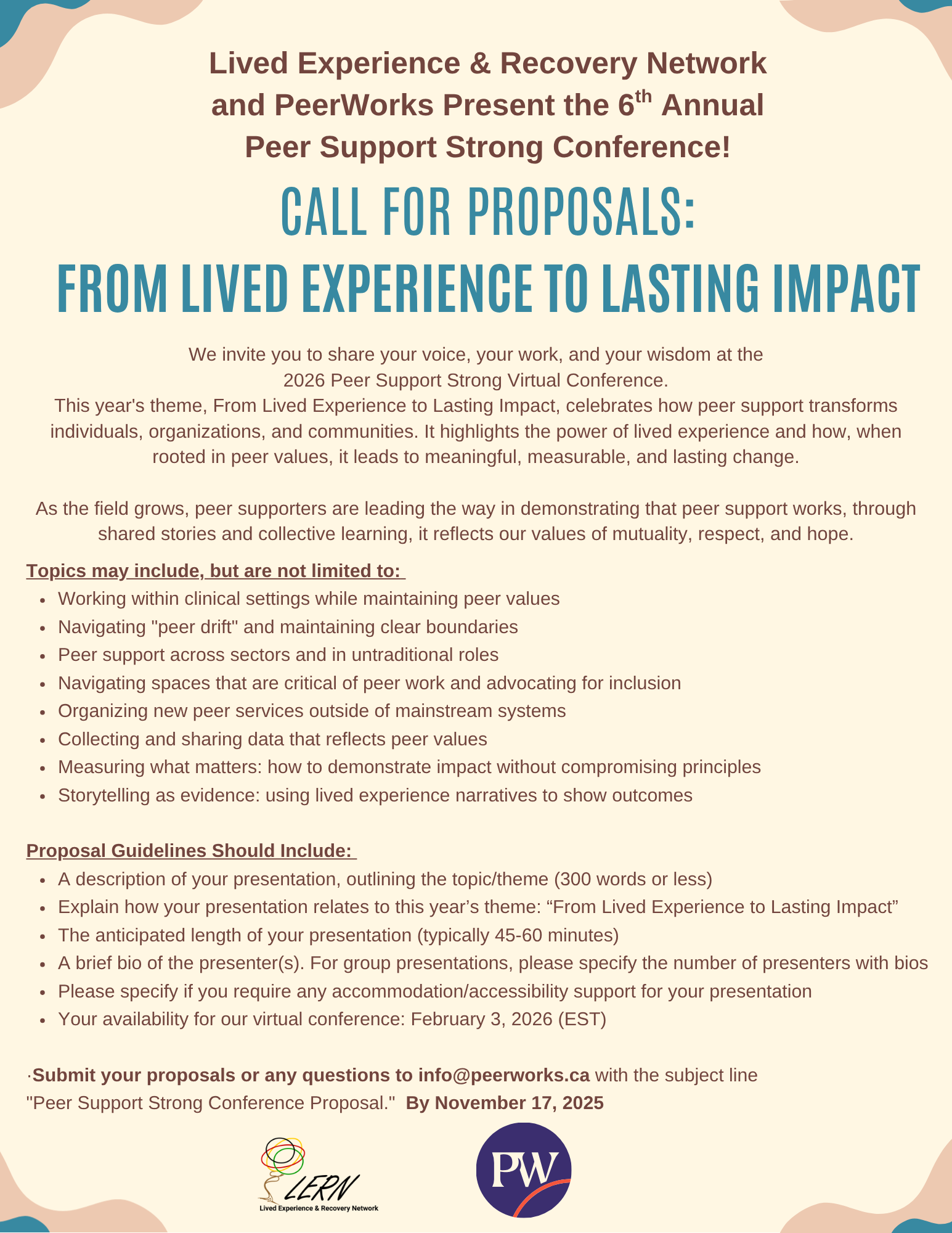 Please submit your proposal by Monday, November 17th, 2025 to info@peerworks.ca with the subject line “Peer Support Strong Conference Proposal.”