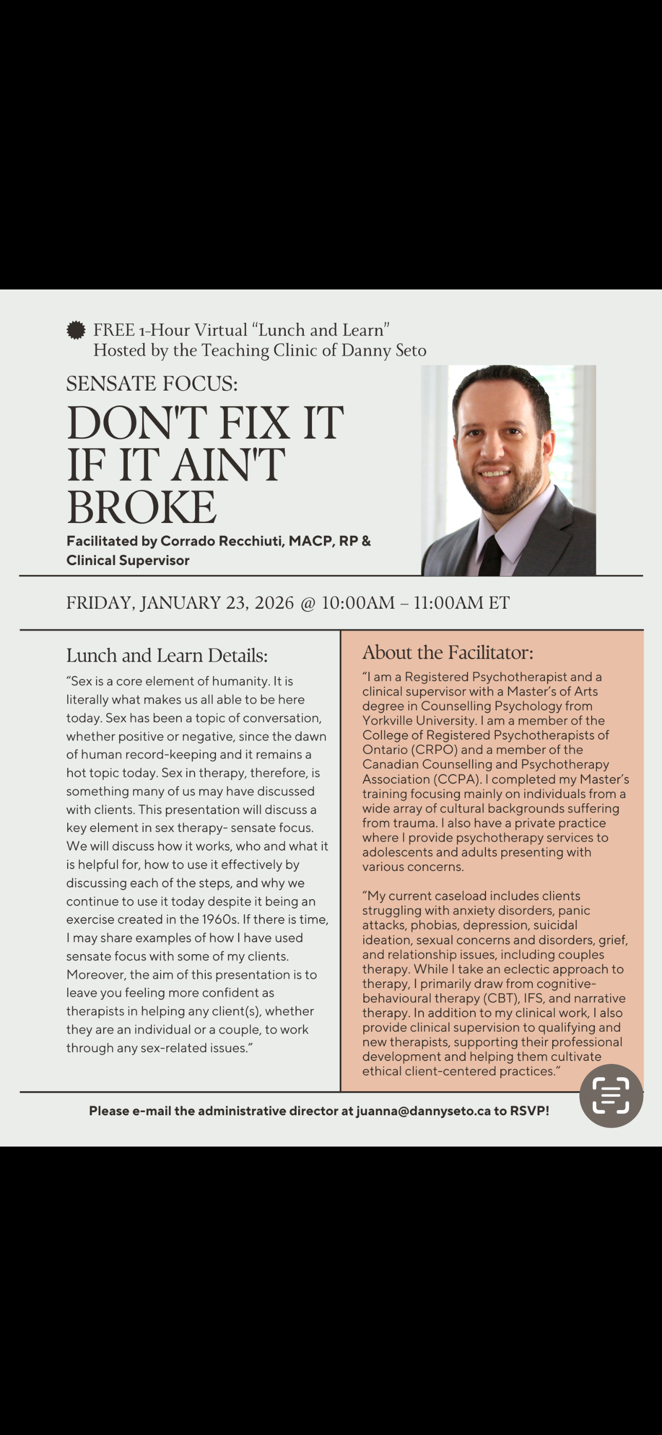 The topic is “Sensate Focus: Don’t Fix It If It Ain’t Broke” and will be led by supervisor-in-training, Corrado Recchiuti, RP.