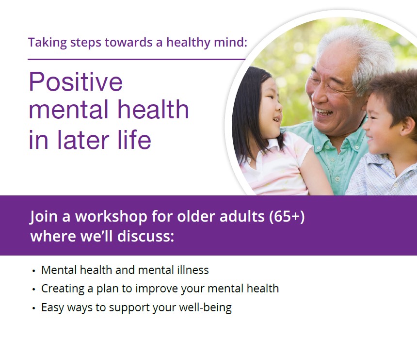 Please join us on Thursday Dec 18th 2025 from 1pm - 2pm for the Understanding Positive Mental Health in Later Life Workshop. This free workshop is for older adults (65+) and their caregivers, where we will discuss:
