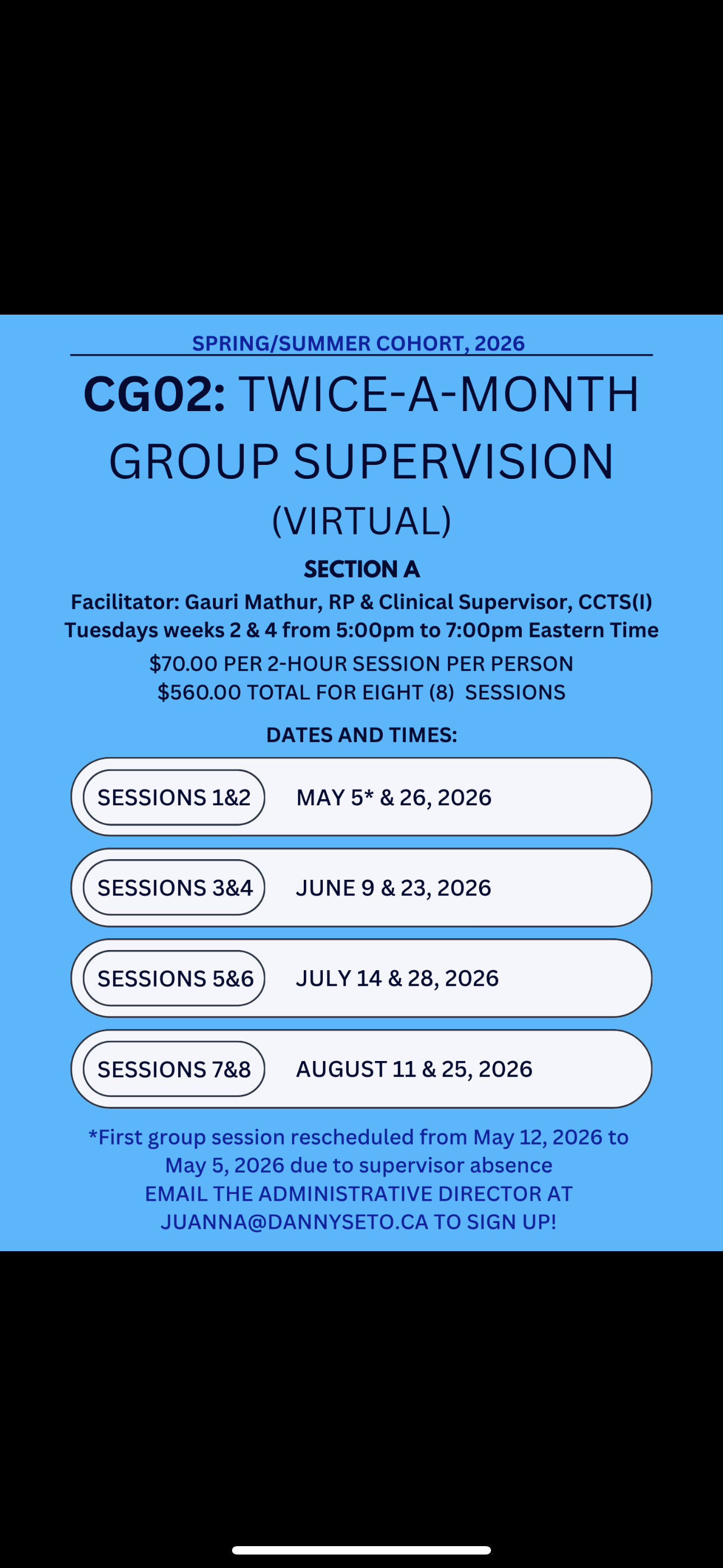 This Clinical Supervision Group meets biweekly during the Spring/Summer, 2026 Cohort (May - August).