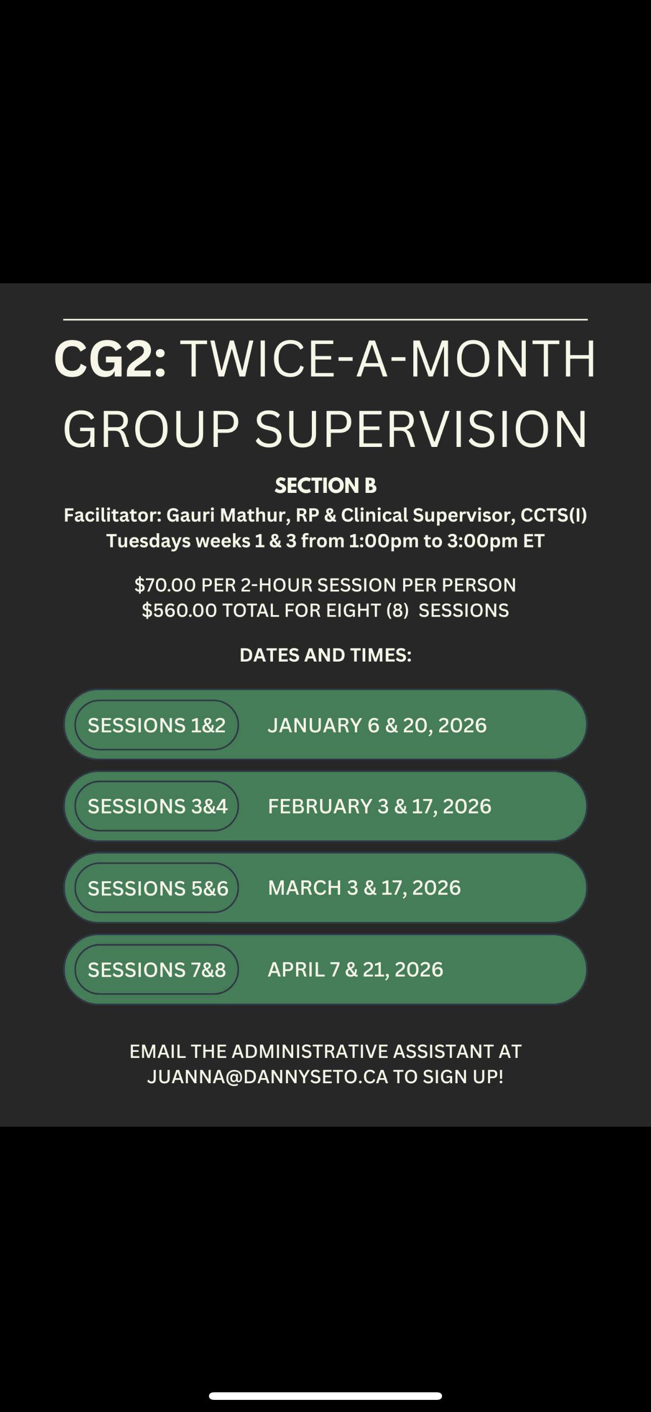 LAST CHANCE to enrol for the biweekly supervision group (BEGINS TOMORROW)!!! This virtual group, hosted by “The Teaching Clinic” is held weeks 1/3 Tuesdays every month at 1:00 p.m. - 3:00 p.m. EST during the Winter, 2026 Cohort (January - April).