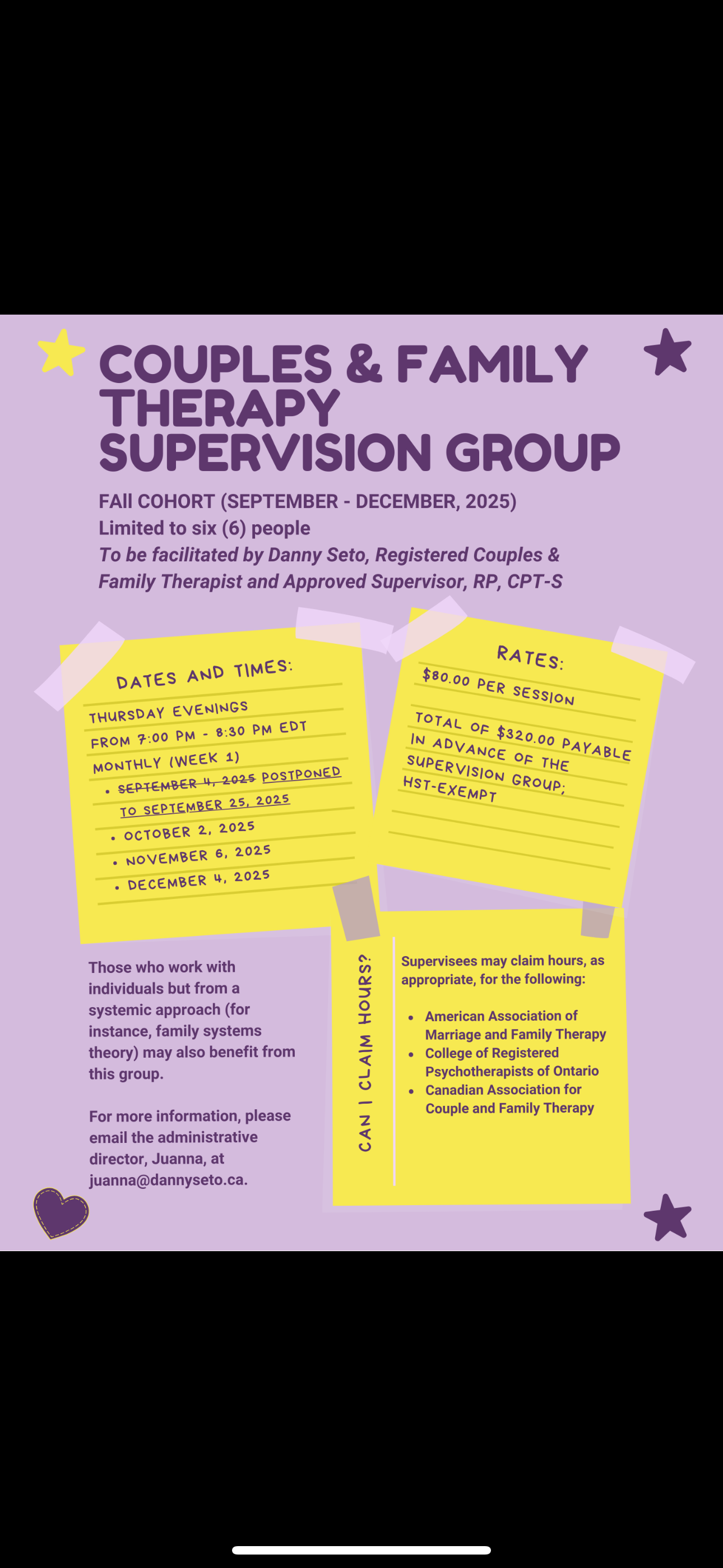 This small group will be hosted by The Teaching Clinic and facilitated by Danny Seto, RP & Clinical Supervisor, Registered Couple/Marriage & Family Therapist and Approved Supervisor, CPT-S.