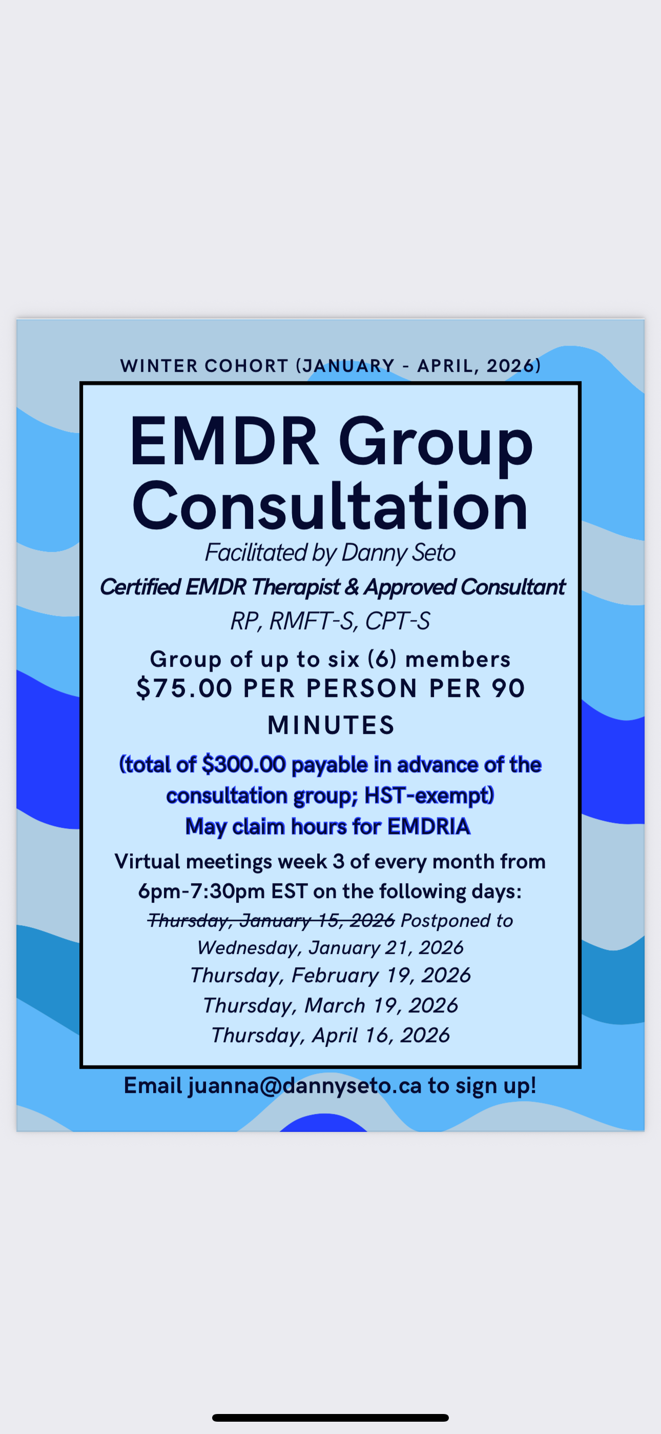 This virtual group is perfect for those who would like to become a Certified EMDR Therapist through EMDR Canada and/or EMDRIA as well as those who would like to increase their knowledge and skills of EMDR. See flyer for more information. Email the Administrative Director, Juanna at juanna@dannyseto.ca, if you would like to register for this EMDR Consultation Group.