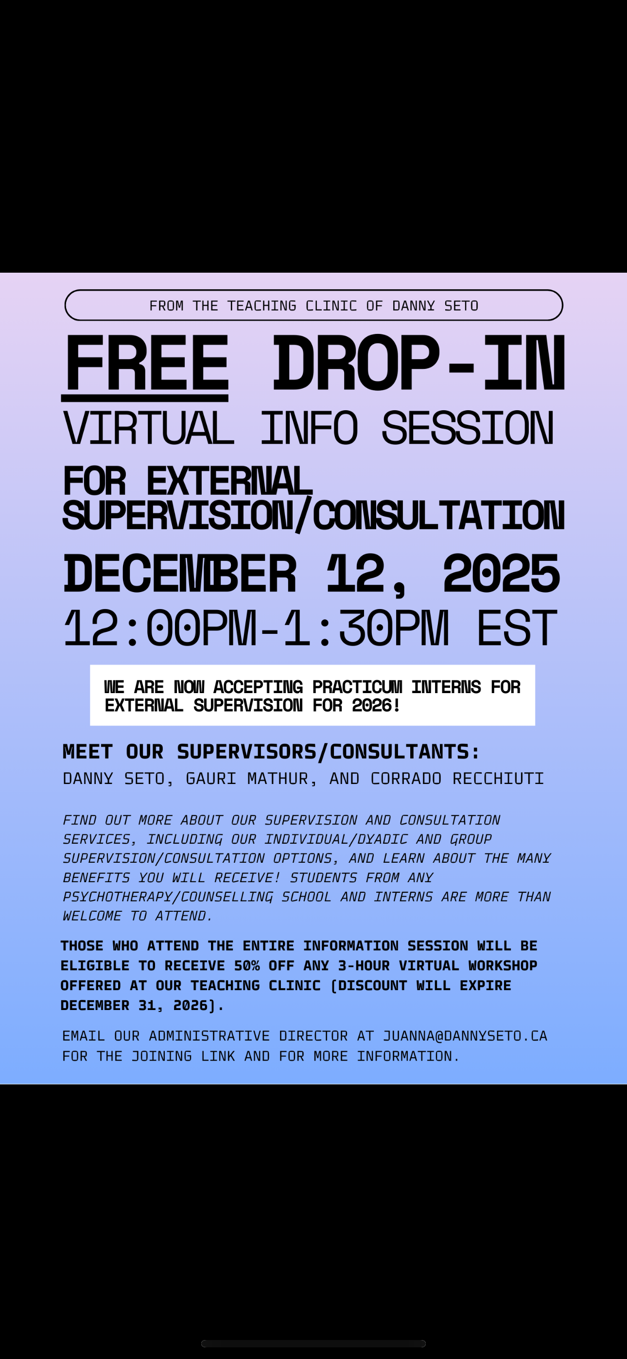 THE TEACHING CLINIC will be facilitating another virtual Information Session on Friday, December 12, 2025 for those inquiring and/or interested in supervision/consultation services!