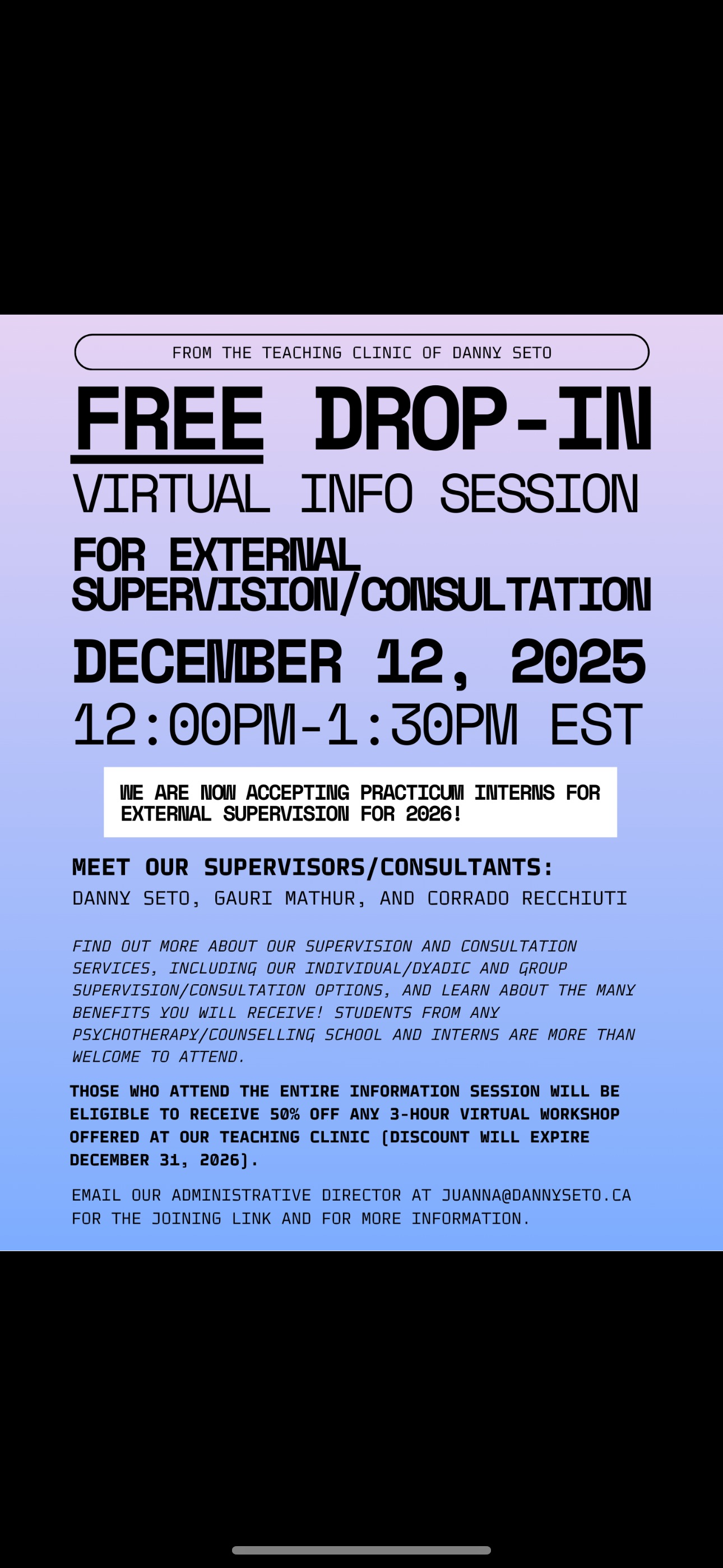 This virtual Information Session will be held tomorrow (Friday, December 12) at 12:00 p.m. - 1:30 p.m. EST for those inquiring and/or interested in supervision/consultation services!