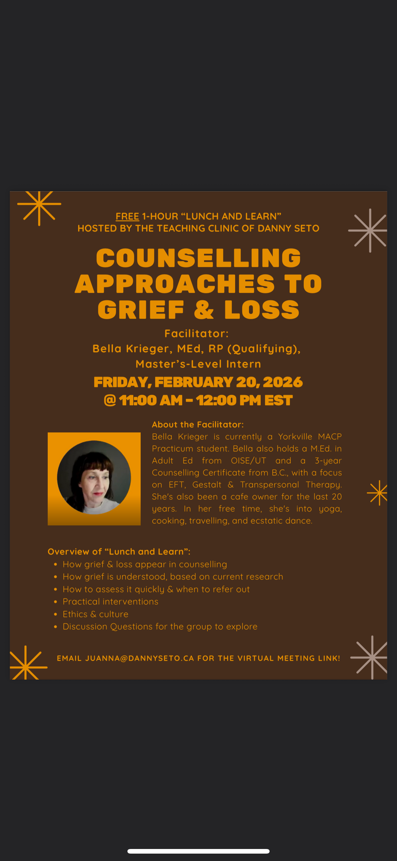The topic, “Counselling Approaches to Grief &!Loss”, will be led by a Master’s-Level Practicum Student and Registered Psychotherapist (qualifying).