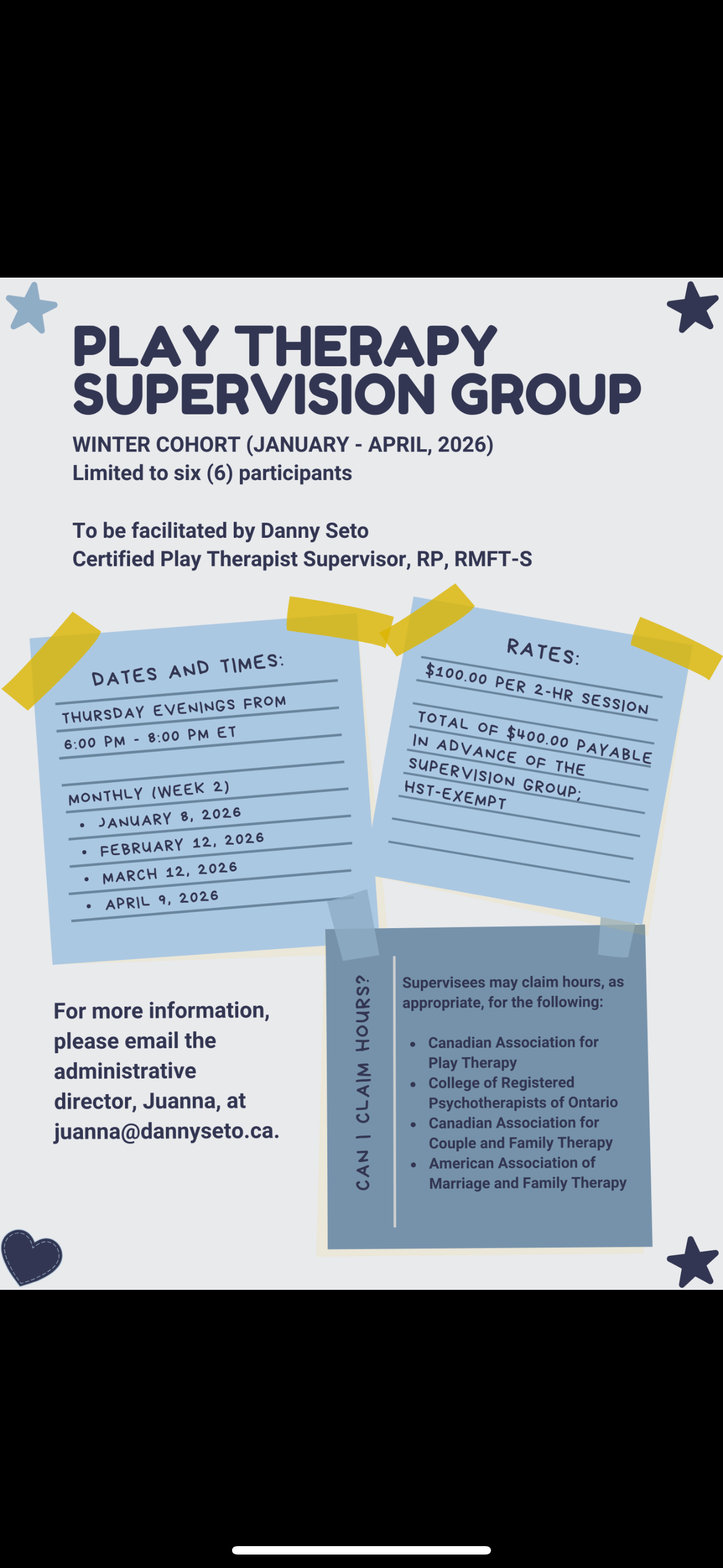ONLY TWO (2) SPOTS REMAINING for the specialized Supervision group in “Play Therapy”.