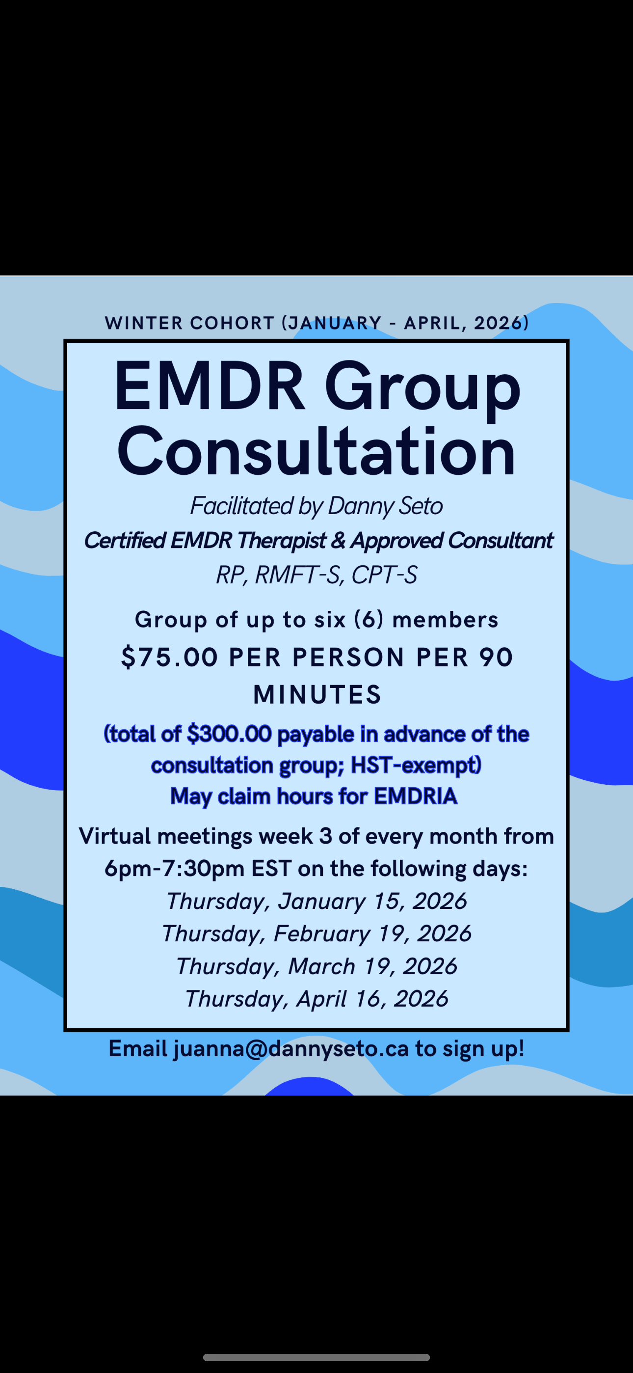 This monthly group will be facilitated by a Certified EMDR Therapist & Approved Consultant and will be held on week 3 Thursdays of every month from 6:00 p.m. - 7:30 p.m. EST during the Winter, 2026 Cohort (January - April). This virtual group is perfect for those who would like to become a Certified EMDR Therapist through EMDRIA as well as those tho would like to increase their knowledge and skills of EMDR. See flyer for more information. Email the Administrative Director, Juanna, if you would like to register for this EMDR Consultation Group. We are hoping you are able to join us!
