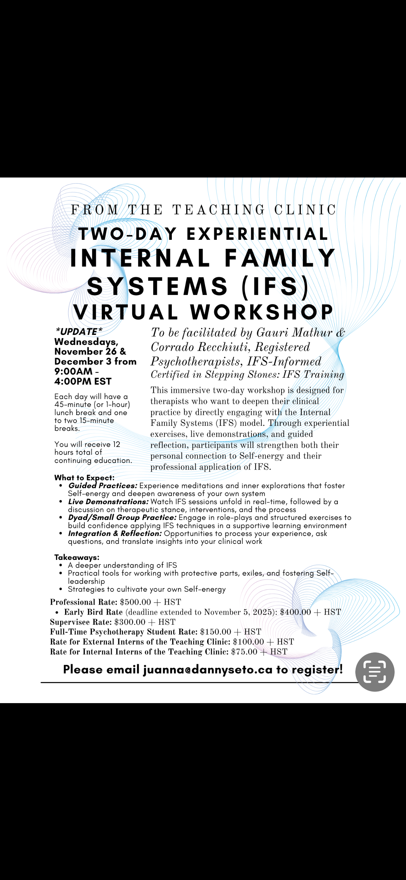 This virtual workshop is being facilitated by Gauri Mathur & Corrado Recchiuti (both RPs and Clinical Supervisors, Certified in the Comprehensive Stepping Stones IFS Training & IFS-Informed).