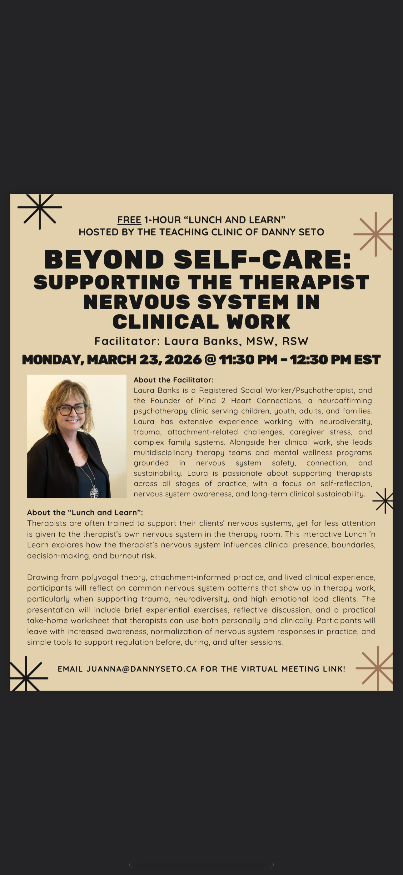 The topic, “Beyond Self-Care: Supporting the Therapist Nervous System in Clinical Work” will be led by Laura Banks, MSW, RSW, Psychotherapist, and Supervisor-in-Training.