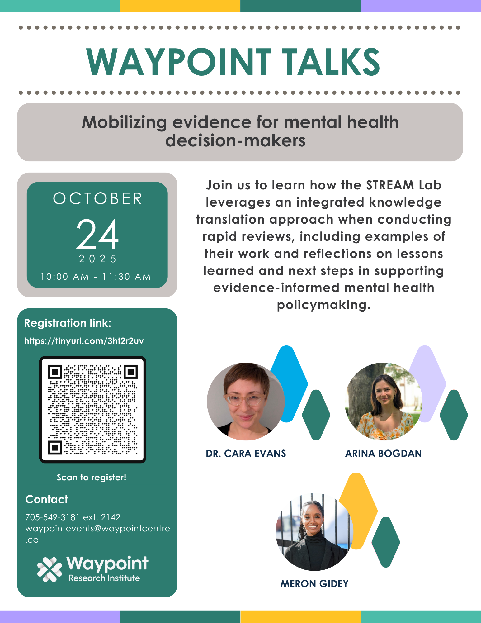 Join us on October 24th, 2025 to learn how the STREAM Lab leverages an integrated knowledge translation approach when conducting rapid reviews, including examples of their work and reflections on lessons learned and next steps in supporting evidence-informed mental health policymaking.