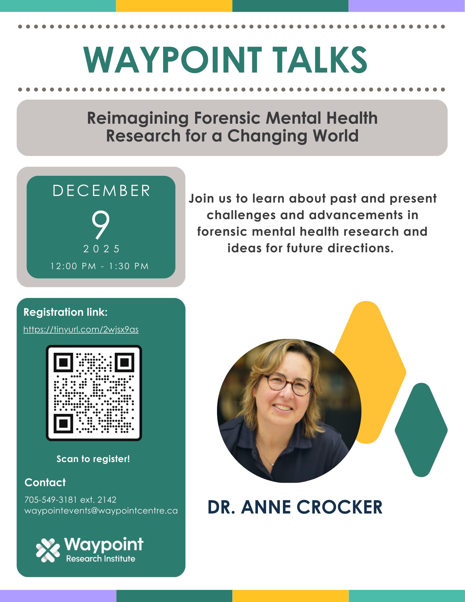 Join us for our final Waypoint Talks event of 2025 to learn about past and present challenges and advancements in forensic mental health research and ideas for future directions. Hosted by Dr. Anne Crocker, this session will explore advancements in research, policy, and practice have helped to build a deeper understanding of the intersection between mental health and the justice system. This presentation looks back and critically examinee the legacy of past research – one that has provided both a foundation to build upon and, at times, shifting ground that complicates progress, particularly for historically marginalized groups – while also considering the evolving challenges we face.